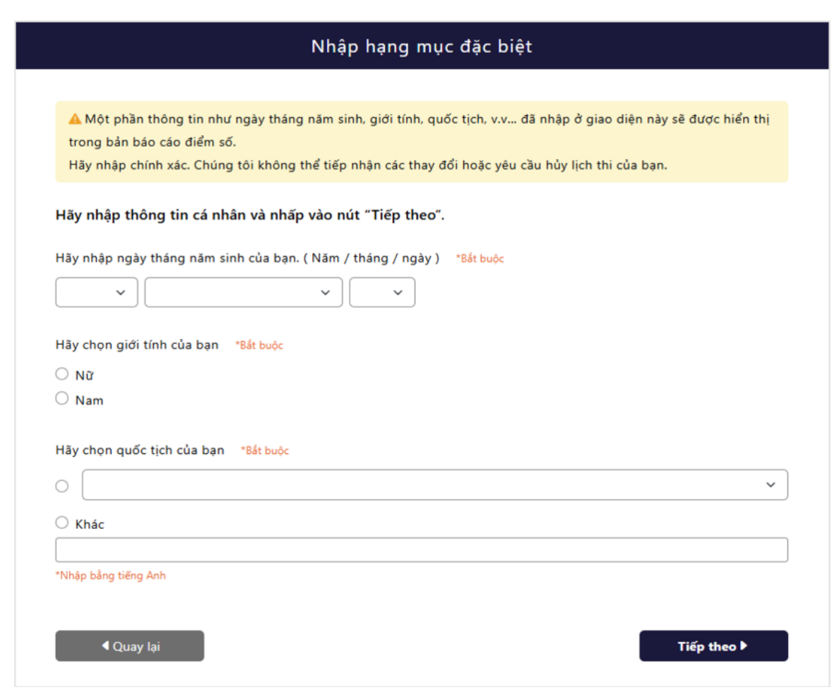 Các thông tin bạn nhập (ngày sinh, giới tính và quốc tịch) sẽ được hiển thị trên bảng điểm. Vui lòng nhập và kiểm tra chính xác vì ngay cả khi có sai sót trong nội