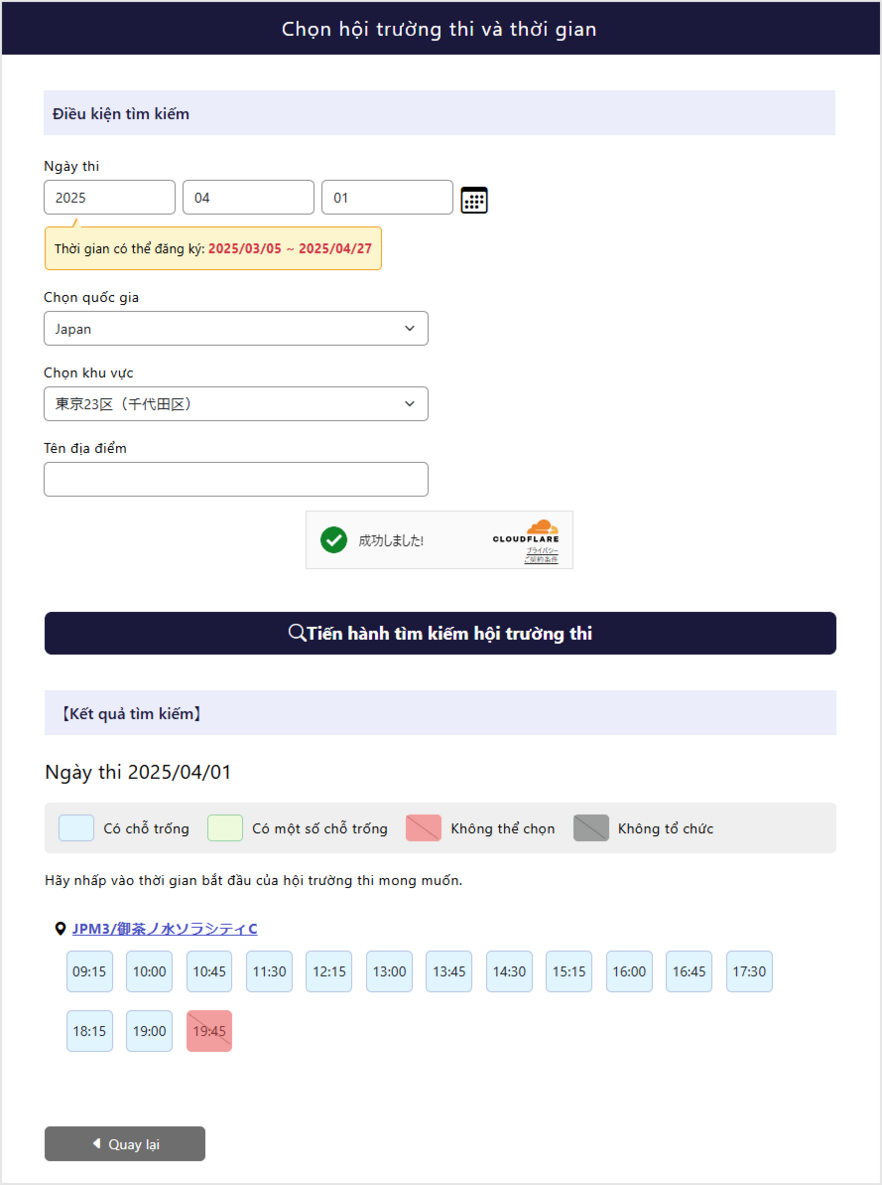 Chọn ngày thi và khu vực thi mong muốn rồi nhấp vào “Tìm kiếm Hội trường thi” để hiển thị Hội trường thi và ngày thi còn chỗ trống.