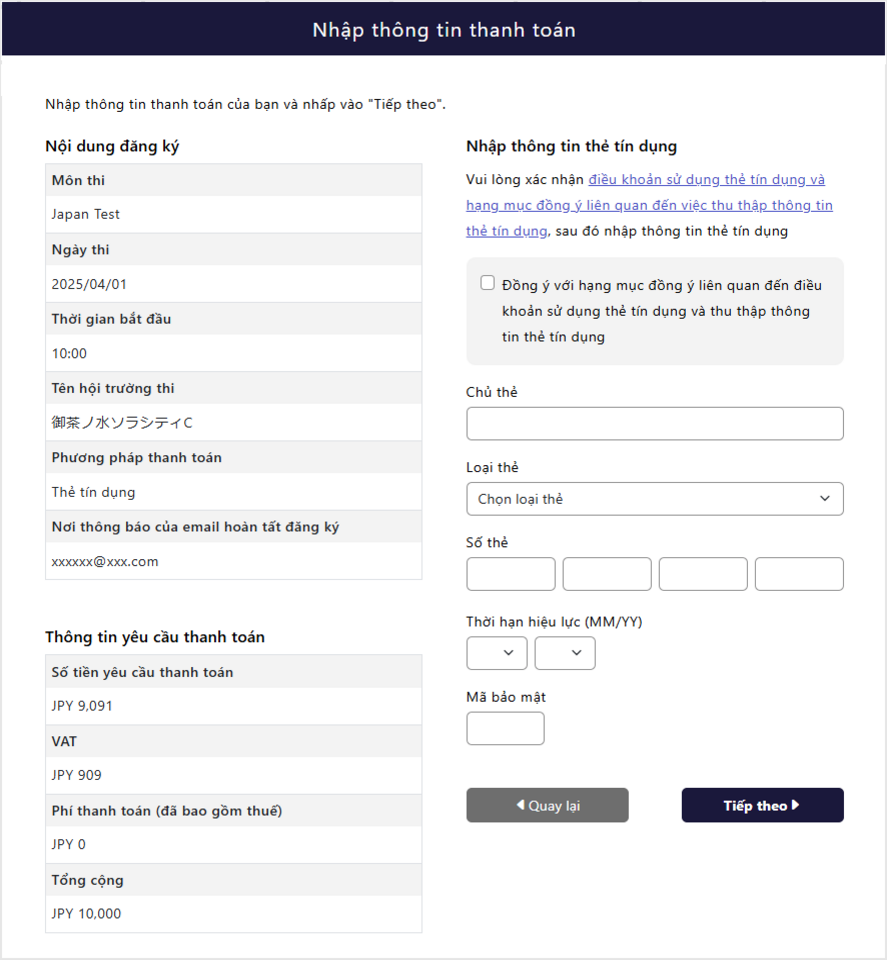 Vui lòng kiểm tra thời gian thi và thời gian đăng ký được đăng tải trên trang thi: https://www.prometric-jp.com/vi/ssw/schedule/