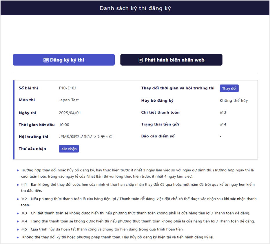Lưu ý: Sau khi đặt lịch thi, sẽ không thể thay đổi hoặc hủy lịch. Ngoài ra, lệ phí thi cũng sẽ không được hoàn lại