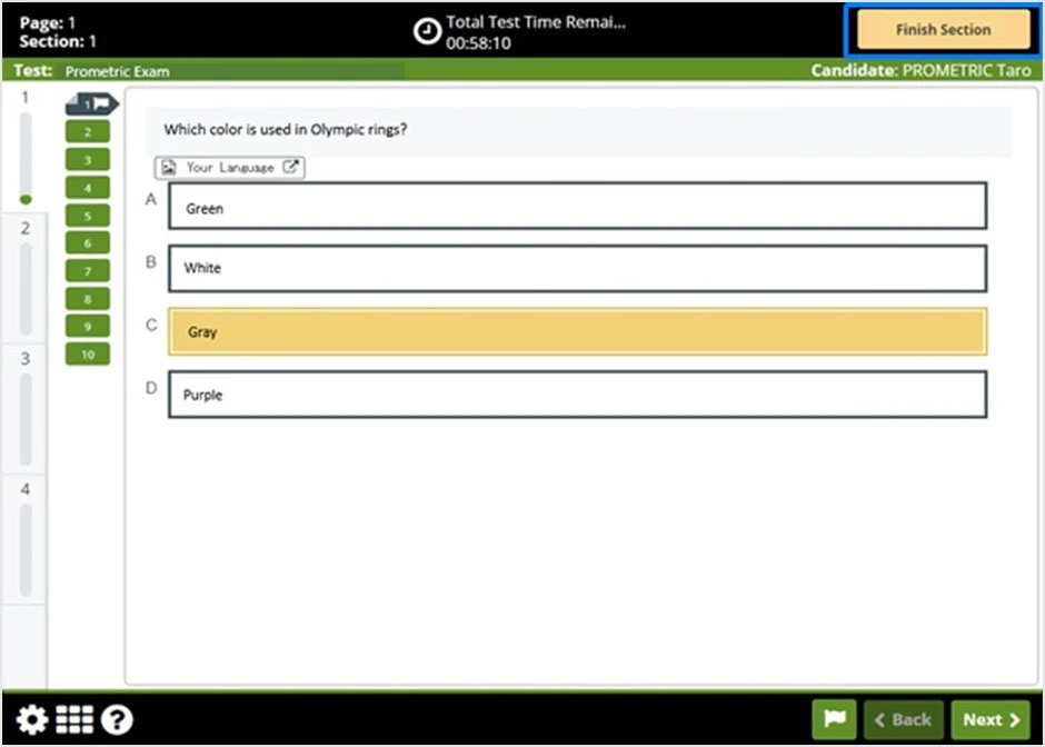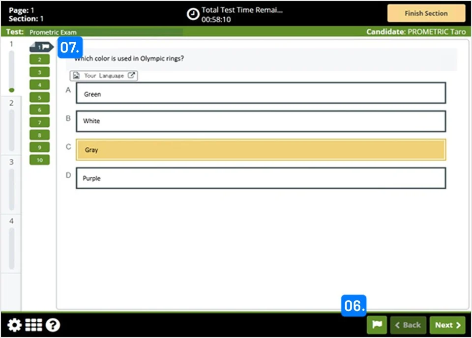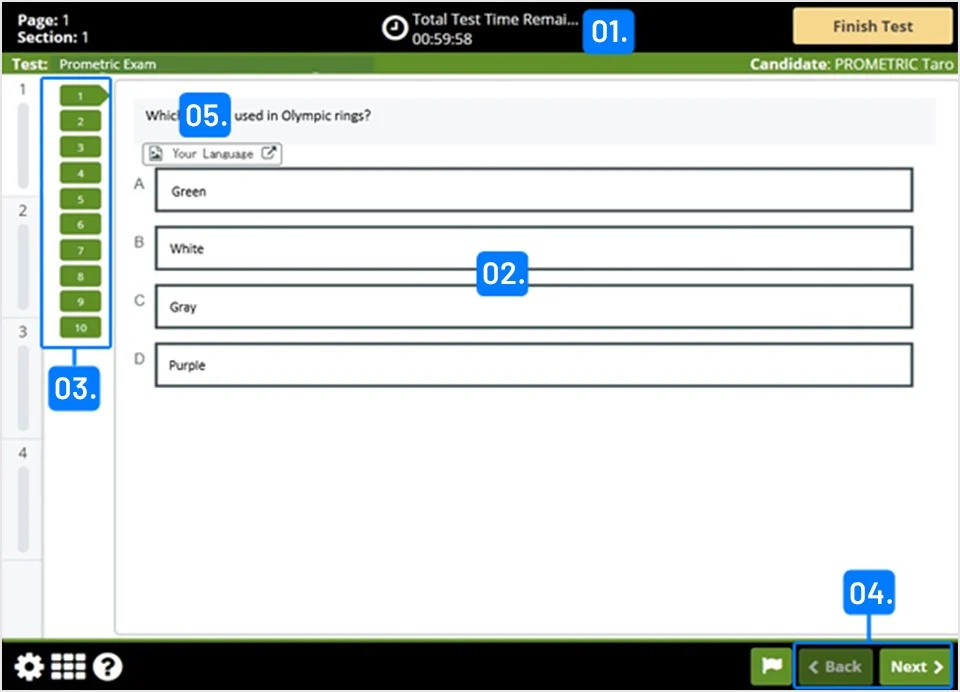 04. Bạn có thể nhấp vào nút “Quay lại (Back)” hoặc “Tiếp theo (Next)” để chuyển từng câu hỏi.