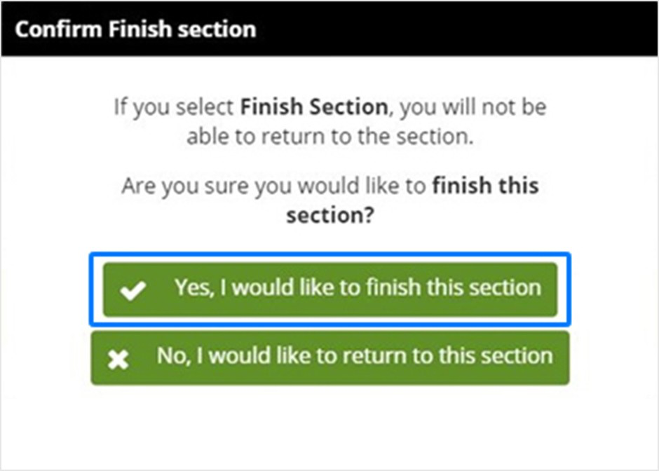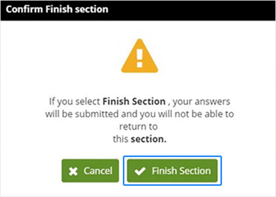 Một thông báo xác nhận sẽ xuất hiện lần nữa. Nếu bạn đã hoàn tất, hãy nhấp vào “Finish Section/ Hoàn tất phần”.